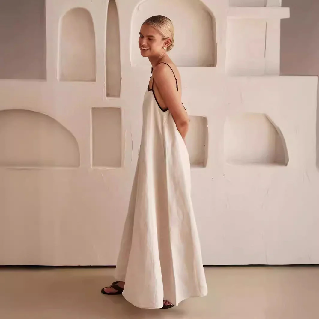 Discover the perfect balance of comfort and style with this maxi dress featuring a striking black contrast trim. Its lightweight linen-blend fabric keeps you cool while the flowing trapeze shape flatters every figure. Adjustable straps and a back tie ensure a customizable fit that moves with you. Whether you're headed to brunch or a casual day out, this dress offers versatility and effortless charm.